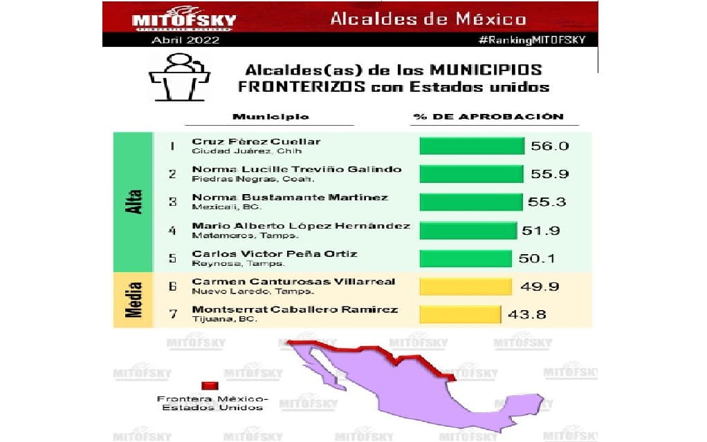 Encabezando la encuesta con una aprobación del 56 por ciento se colocó el alcalde de Ciudad Juárez, Chihuahua, Cruz Pérez Cuellar; en la segunda posición se ubicó a la alcaldesa de Piedras Negras, Norma Lucille Treviño Galindo con un 55.9 por ciento.