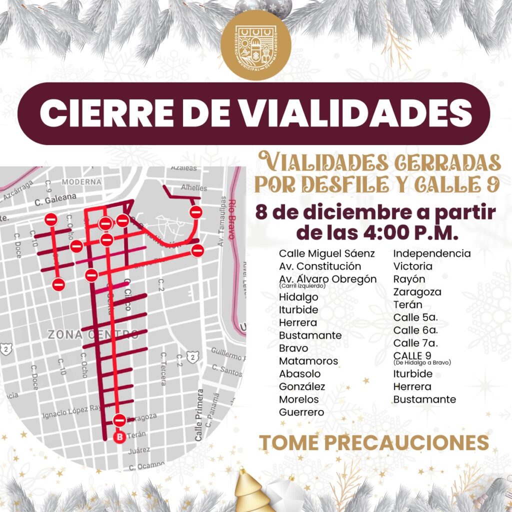 El Gobierno de Matamoros informa a todos los automovilistas, que debido a la realización del desfile navideño, el viernes 8 de Diciembre a partir de las 16:00 horas, varias arterias de la ciudad serán cerradas a la circulación, por este motivo exhorta a circular por vías alternas.Este es el croquis de calles que permanecerán cerradas a partir del horario antes mencionado.