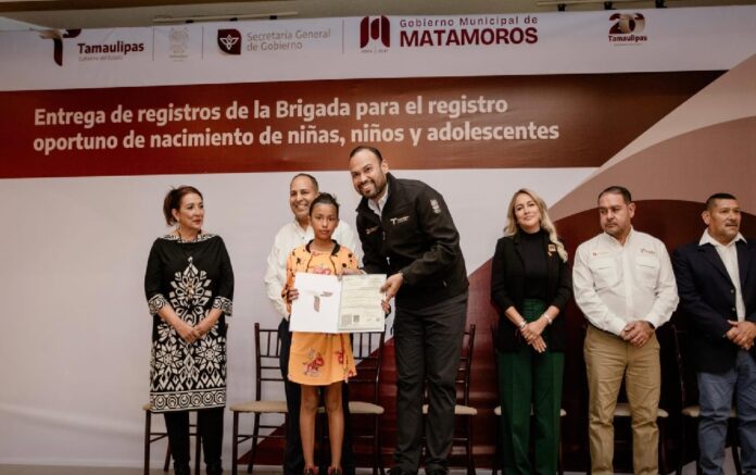 Matamoros, Tamaulipas.- Con el objetivo de garantizar el acceso a los derechos fundamentales de las y los ciudadanos, se llevó a cabo en Matamoros, la entrega simbólica de registros de nacimiento como parte de la Brigada de Registro Civil para el Registro Oportuno de Nacimiento de Niñas, Niños, Adolescentes y Adultos Mayores.
