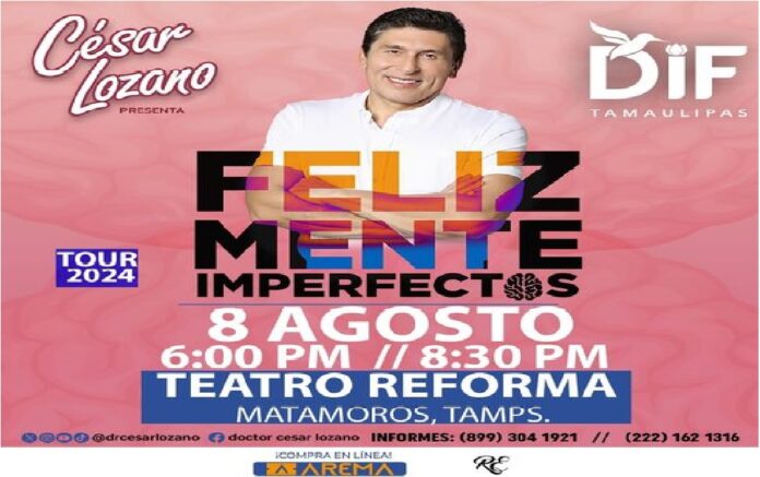 Ciudad Victoria, Tamaulipas.- Los próximos 7 y 8 de agosto, el destacado conferencista César Lozano impartirá su ponencia «Felizmente Imperfectos” en Tamaulipas; parte de lo que se recaude por la venta de boletos será destinado a los programas asistenciales del Sistema DIF Tamaulipas que preside la doctora María de Villarreal.