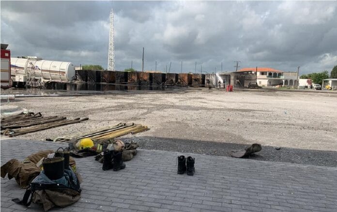 Matamoros.- Los elementos del Heroico Cuerpo de Bomberos de Matamoros controlaron completamente el incendio registrado en un estacionamiento de pipas cargadas de combustible, sin embargo continúan trabajando en la zona colocando sulfato a contenedores y en áreas donde hubo derrame de aceite, esto, con la finalidad de evitar que se reinicie el fuego.