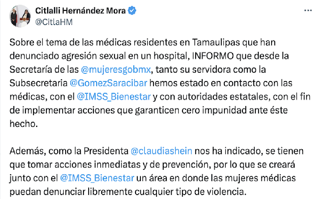 “Sobre el tema de las médicas residentes en Tamaulipas que han denunciado agresión sexual en un hospital, INFORMO que desde la Secretaría de las @mujeresgobmx, tanto su servidora como la Subsecretaria @GomezSaracibar hemos estado en contacto con las médicas, con el @IMSS_Bienestar y con autoridades estatales, con el fin de implementar acciones que garanticen cero impunidad ante éste hecho.