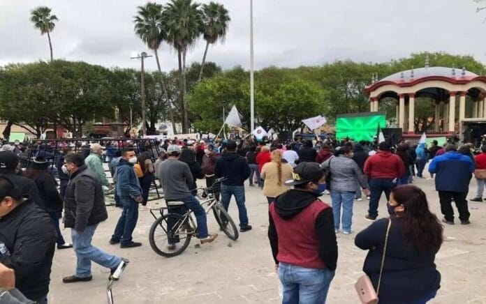 Matamoros.- Este sábado en la Plaza Principal simpatizantes del movimiento obrero 20/32 acudieron al llamado de la licenciada Susana Prieto Terrazas, quien a través de una pantalla en trasmisión realizada desde Ciudad Juárez aseguró que por ley las empresas deben otorgar un bono de 10 mil 159 pesos a los trabajadores y un aumento salarial del 15%, por lo que lanzó un ultimátum para este 24 de enero y de no lograr el acuerdo podrían irse a huelga.