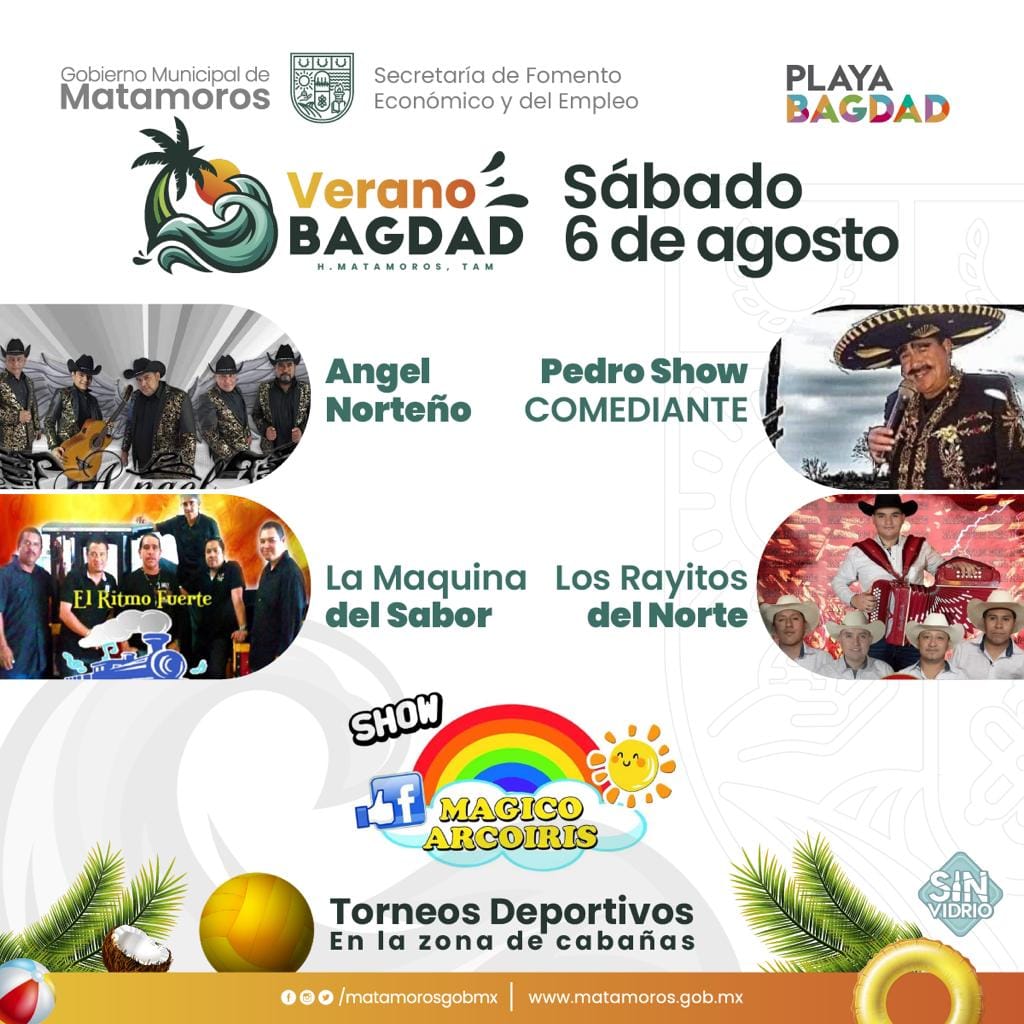 MATAMOROSDiversión familiar en playa Bagdad este sábadoPor Gricelda Guerra - 06/08/2022036FacebookTwitterPinterestWhatsApp