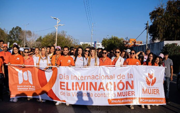 La presidenta del Sistema DIF Municipal, Ana Ariceaga de Granados y la secretaria de Bienestar Social, Perla Medina Ruíz, acompañadas de los consejos vecinales municipales y la Banda de Música «Halcones Marching Band» de la Preparatoria «Ricardo Flores Magón» alzaron la voz por todas aquellas mujeres víctimas de violencia y para exigir la creación de políticas que erradiquen la agresión hacia las mujeres y construyan un mundo libre de discriminación y desigualdad.