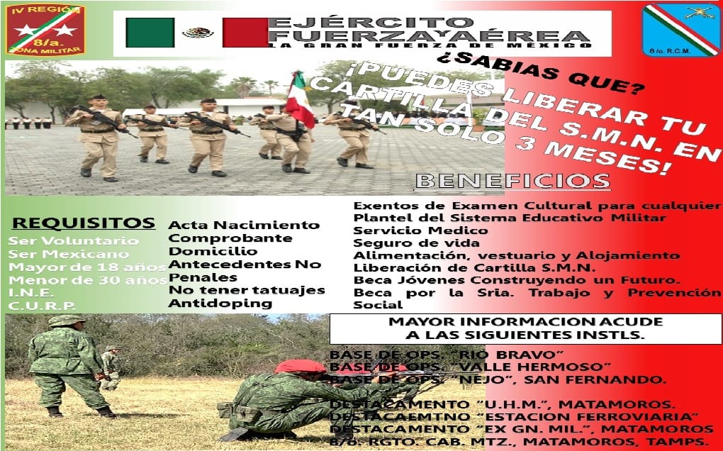 H. Matamoros, Tamps. a 21 de septiembre del 2022, La Secretaría de la Defensa Nacional a través de la Comandancia del 8/o. Regimiento de Caballería Motorizado, informa a la opinión pública e invita a los jóvenes en edad de cumplir con su deber constitucional, en situación de encuadrado durante tres meses dentro de la 4/a. Compañía del Servicio Militar Nacional, ubicada en Apodaca, N.L., para el efecto se proporcionan los requisitos, derechos y beneficios para ser integrados a dicha Compañía: