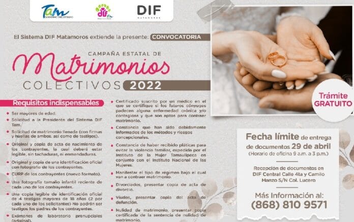 A partir de este jueves 07 de abril el Sistema DIF Matamoros iniciará la recepción de documentos de la Campaña Estatal de Matrimonios Colectivos que realiza el Sistema DIF Tamaulipas.