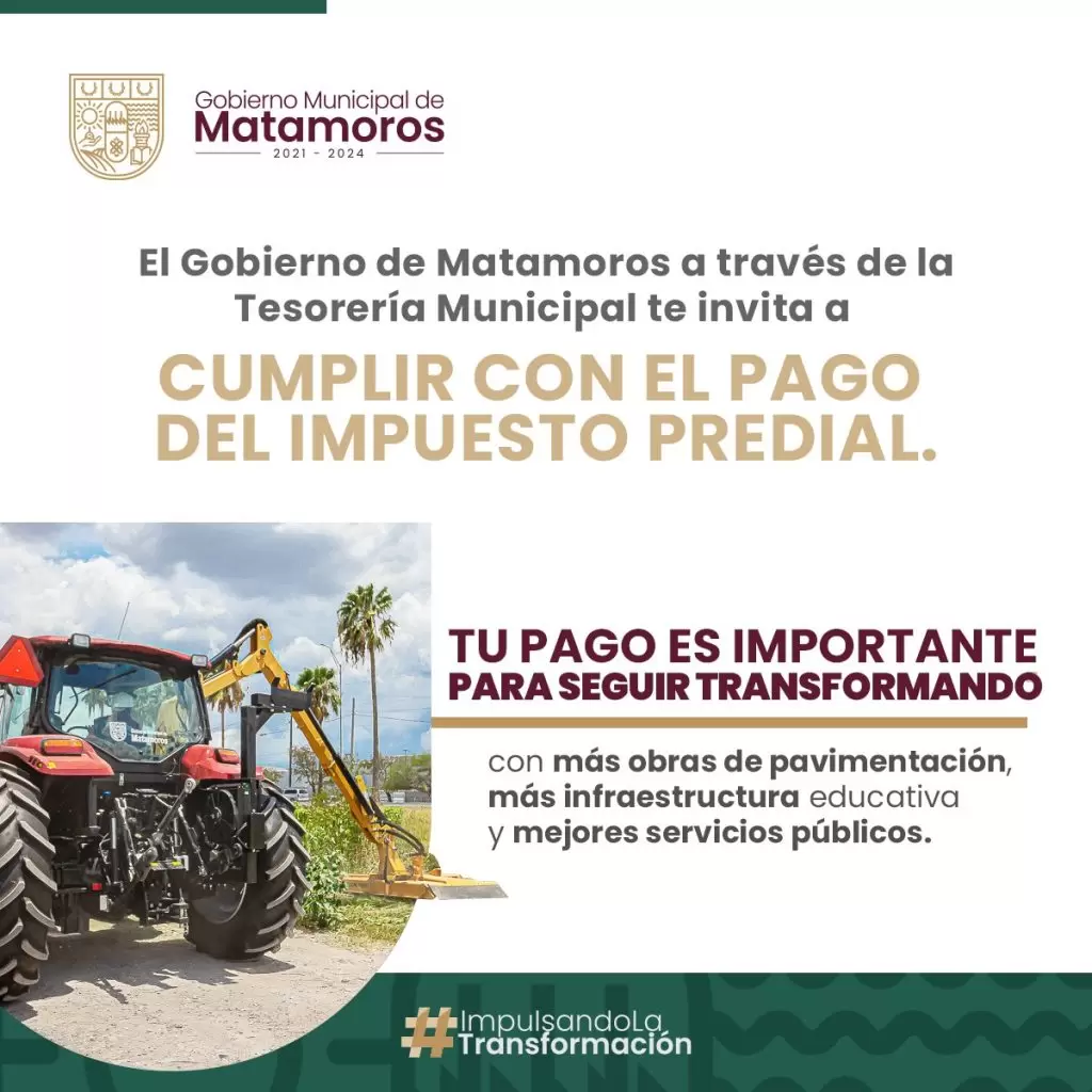 El Gobierno de Matamoros invita a los contribuyentes del Impuesto Predial a ponerse al corriente en el pago de este gravamen municipal.
