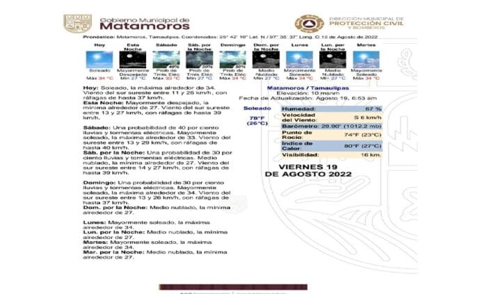 MATAMOROSProtección Civil informa sobre posibilidades de lluviasPor Gricelda Guerra - 19/08/2022047FacebookTwitterPinterestWhatsApp El Gobierno de Matamoros a través de la Dirección de Protección Civil a cargo de Jorge Orizaga Castañeda informa que el pronóstico de lluvias para este fin de semana, es de un 40% para el sábado y un 30% para el domingo.
