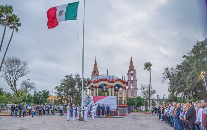 El izamiento de bandera estuvo a cargo de elementos de la Primera Zona Naval, en tanto que el escudo de Tamaulipas fue portado por la escolta de la Secundaria Técnica Número 46, institución que también participó con su banda de guerra.