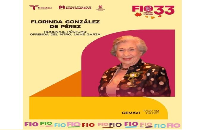 H. Matamoros, Tamaulipas.- Dentro del marco de la 33ª edición del Festival Internacional de Otoño se rendirá emotivo homenaje póstumo en honor a la Sra. Florinda González de Pérez, Presidenta Fundadora del FIO, como un reconocimiento a su invaluable aportación al desarrollo cultural de la ciudad.