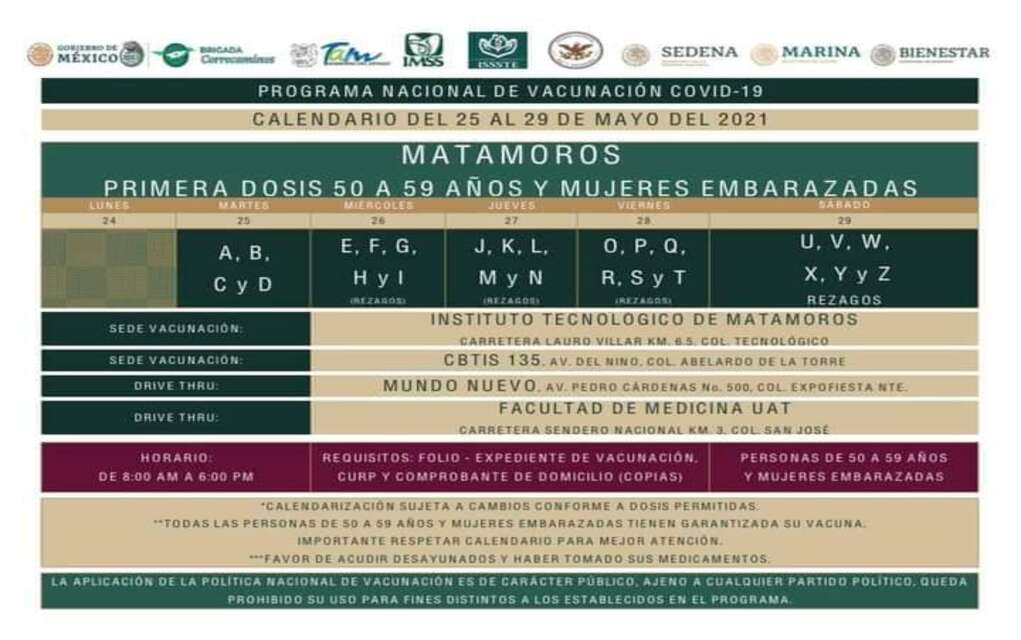 Será del 25 al 29 de mayo, en un horario de 8 de la mañana a 6 de la tarde, cuando se estará aplicando la primera dosis de la vacuna anti Covid en las cuatro sedes establecidas, siendo estas el Instituto Tecnológico de Matamoros, donde se aplicará bajo la modalidad de drive thru así como a peatones, el CBTIS 135 de la Avenida del Niño, donde se atenderá exclusivamente a quienes lleguen a pie, el Centro de Convenciones Mundo Nuevo, donde serán bajo la modalidad drive thru y la Facultad de Medicina de la UAT, donde se atenderá solo bajo la modalidad de drive thru.
