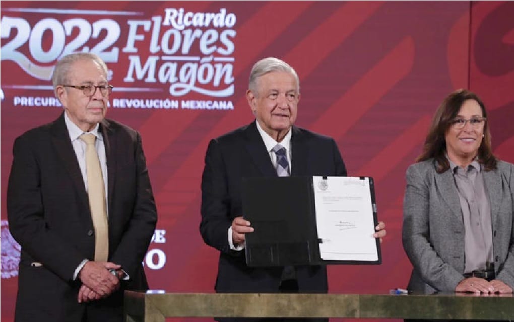Acompañado por la secretaria de Energía, Rocío Nahle; el secretario de Salud, Jorge Alcocer; la consejera Jurídica, María Estela Ríos, el jefe del Ejecutivo dijo que la iniciativa se va al Congreso para su análisis y discusión.