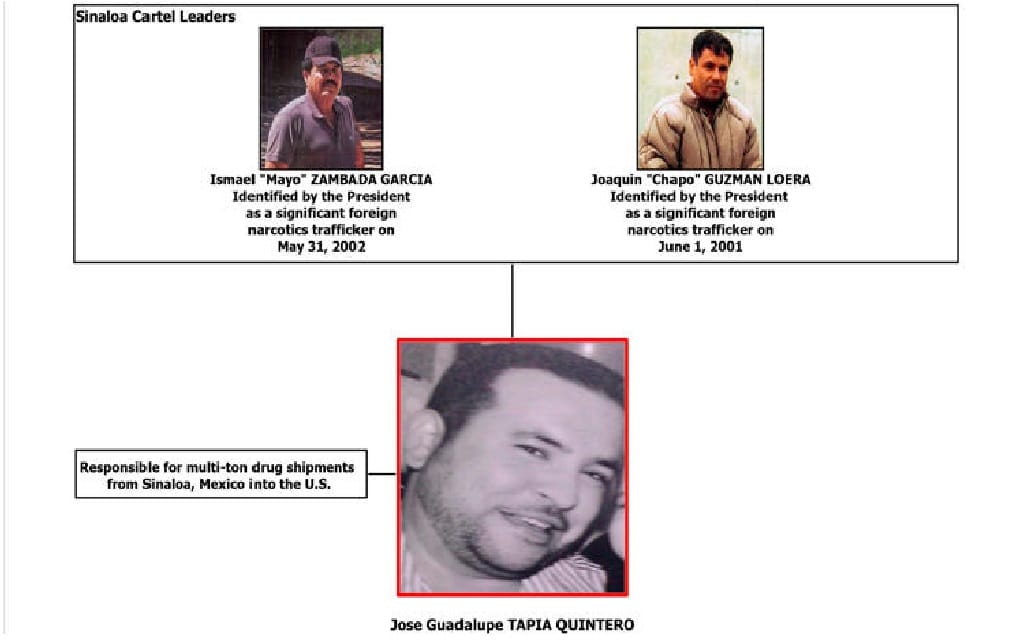 El Departamento del Tesoro de EE UU calificó a El Lupe el 16 de enero de 2014 como un “teniente mayor” del Cartel de Sinaloa por “su rol en el tráfico de drogas de Ismael El Mayo Zambada” y por “jugar un papel significante en el tráfico de drogas internacional”, reza un comunicado de la entidad federal. “Tapia Quintero supervisa el transporte de cocaína y marihuana para la organización de Zambada y es responsable de coordinar la adquisición y el transporte de cocaína y metanfetamina desde Sinaloa a los Estados Unidos, específicamente Arizona y California, mensualmente”, continúa el documento.