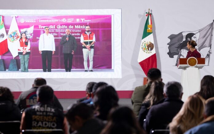 A través de un enlace a Nuevo Laredo, Tamaulipas, la Presidenta Claudia Sheinbaum Pardo encabezó el banderazo de inicio de obra del tramo Arroyo El Sauz-Nuevo Laredo del tren del Golfo de México, cuya construcción generará 10 mil 922 empleos directos y 32 mil 766 indirectos.