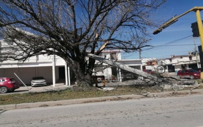 En Avenida Las Fuentes y Circuito Independencia, desde el pasado viernes fue derriba y ahí permanece en medio del camellón y área verde en este sector.