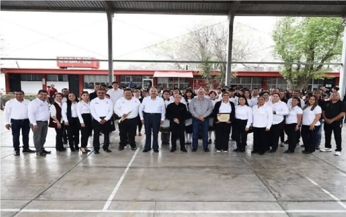 Como muestra de ese compromiso docente, reconoció a la maestra Rosa Isela Méndez Ramírez por sus 33 años de servicio en la educación, cuya dedicación y profesionalismo ha formado a jóvenes tamaulipecos durante más de tres décadas, y también entregó tambores y trompetas a las alumnas y alumnos integrantes de la banda de guerra del plantel.