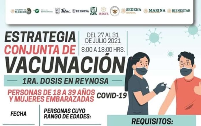 Reynosa, Tam.- La Alcaldesa de esta ciudad invita a la población de 18 a 39 años de edad y mujeres embarazadas a estar pendiente de la Estrategia Conjunta de Vacunación, que será desarrollada por rango de edad del martes 27 de julio al sábado 31, de 8:00 de la mañana a 6:00 de la tarde, con uso de las prácticas sanitarias vigentes