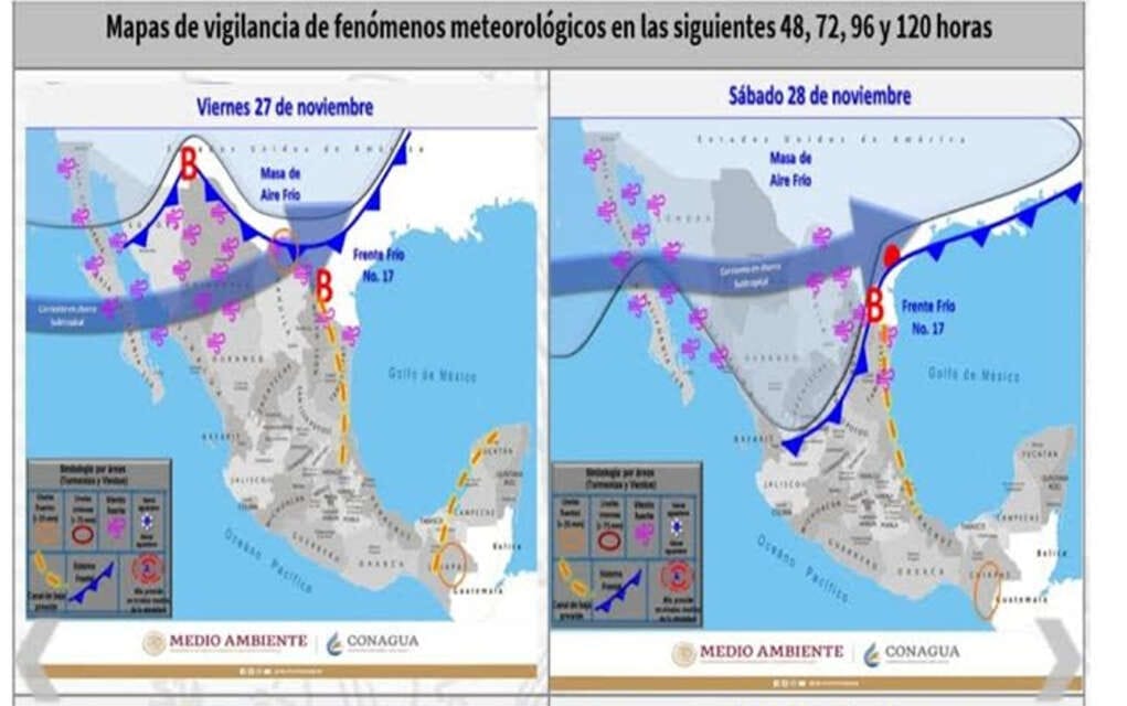 A su ingreso, el frente frío bajará la temperatura de los 23 hasta los 12 Grados Celsius el día sábado 28 de noviembre, en que se vislumbra una probabilidad de precipitación pluvial ligera del 20%, y para el día domingo 29 se prevén 22 Centígrados durante el día para bajar hasta los 8 Celsius por la noche, con posibilidad de lluvia del 10%.