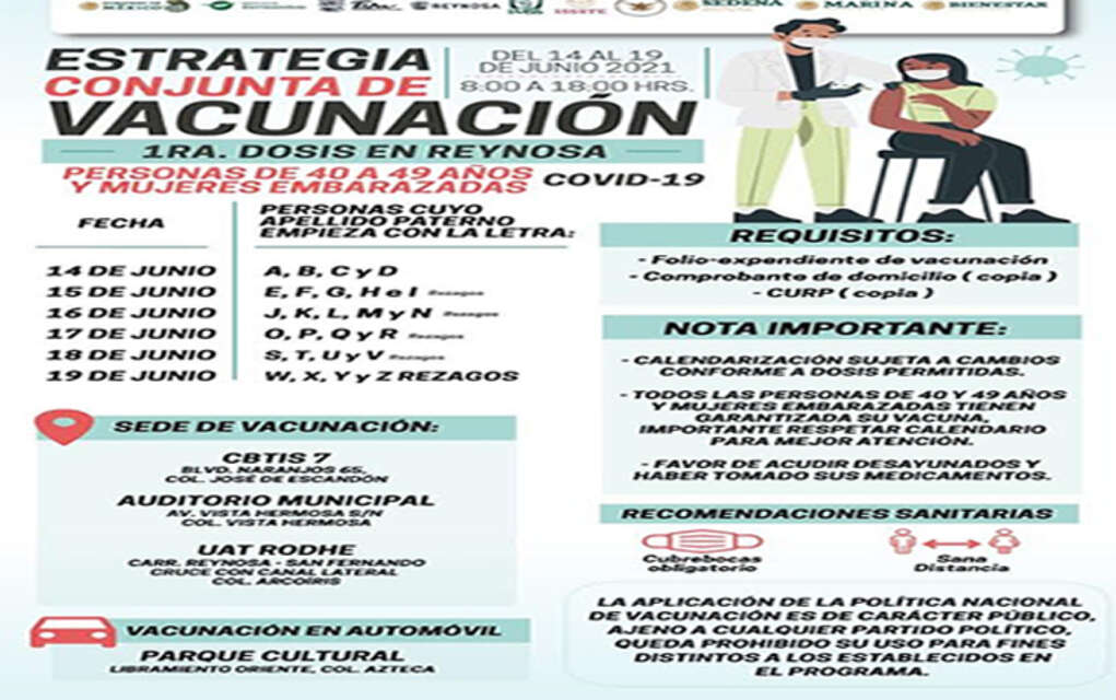 Reynosa.- En representación del Gobierno Municipal de Reynosa, la Doctora Maki Esther Ortiz Domínguez invita a la población de 40 a 49 años, embarazadas y quienes no acudieron en su turno, a recibir la vacuna contra COVID-19, que será aplicada del día lunes 14 al sábado 19 de junio, en orden alfabético, por la letra inicial del primer apellido, portando su Folio ‘Mi Vacuna’, y copias de CURP, y de comprobante de domicilio.