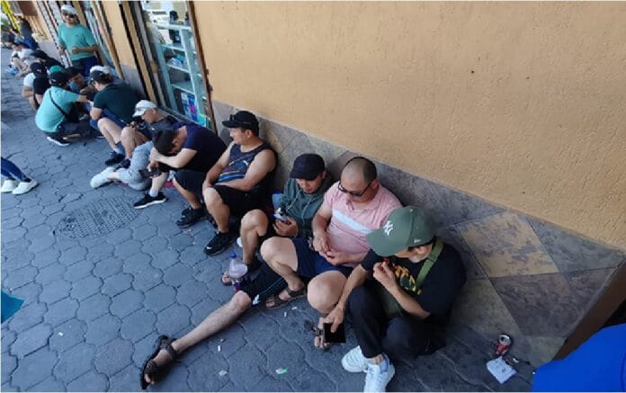 El segundo grupo de migrantes provenientes de Rusia, Kirguistán, y Tayikistán, permanecen apostados en la banqueta de la calle 15 de Junio y Guerrero, frente al Puente Internacional I, esperando ser llamados para cruzar en busca de asilo.