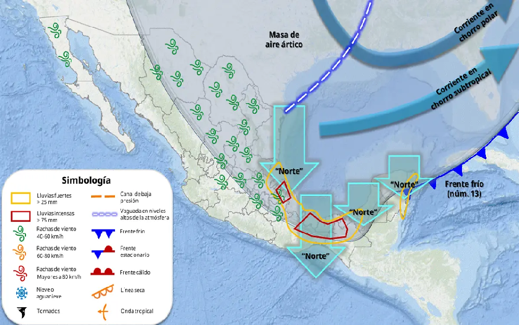 La masa de aire ártica que impulsará al frente, en interacción con una vaguada polar y con las corrientes en chorro polar y subtropical podría generar ambiente frío a gélido, especialmente durante las madrugadas, con temperaturas mínimas de 0 a 5°C en Tamaulipas.