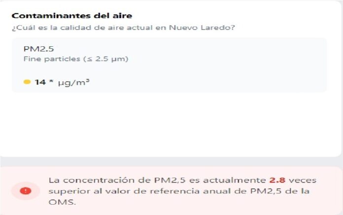 Según la empresa suiza Iqair, la concentración de partículas contaminantes PM2.5 en Nuevo Laredo es 2.8 veces superior al límite anual recomendado por la Organización Mundial de la Salud (OMS).