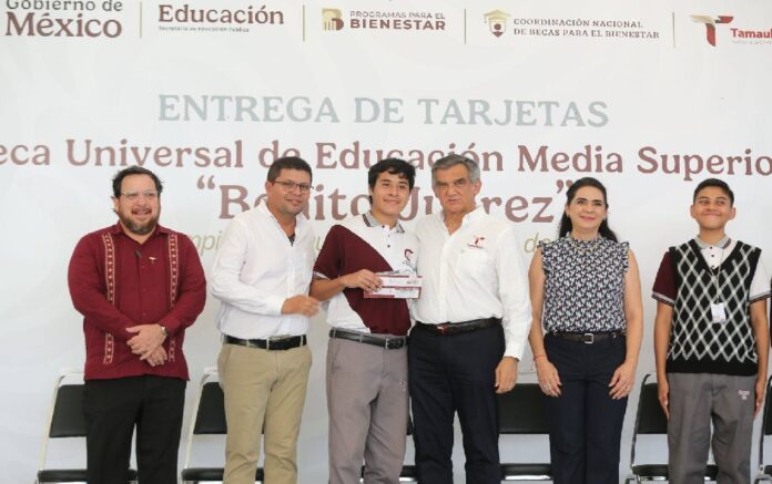 Tampico, Tamaulipas.- Un total de 450 alumnos del CETIS número 22, turno matutino, de esta ciudad, recibieron de manos del gobernador Américo Villarreal Anaya y del delegado de Bienestar Federal, Luis Lauro Reyes Rodríguez, las tarjetas de la Beca Universal de Educación Media Superior «Benito Juárez», lo que representa la dispersión de un millón 710 mil pesos.