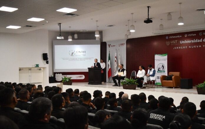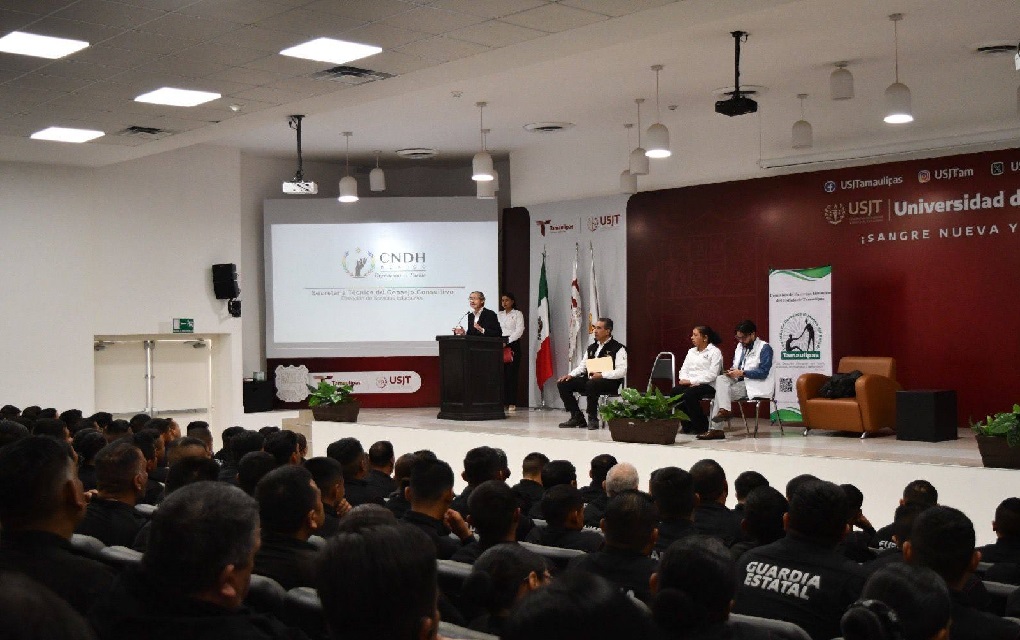 Ciudad Victoria, Tamaulipas.- Ante un auditorio aproximado de 200 policías de la Guardia Estatal, el facilitador de la Comisión Nacional de Derechos Humanos (CNDH), Mario Isaías Torres, impartió una capacitación intensiva centrada en cuatro ejes: Derechos Humanos; Función Policial; Legalidad y Seguridad Jurídica; y Uso de la Fuerza.