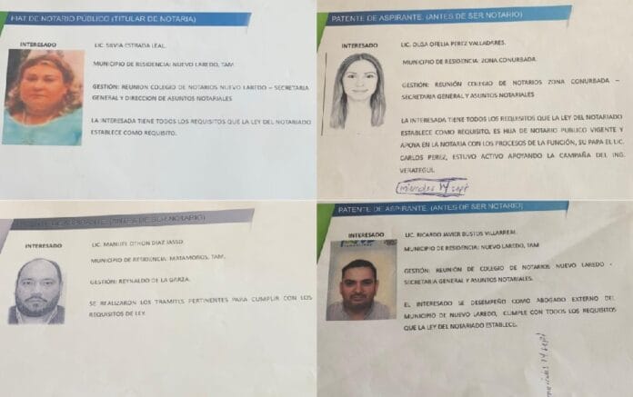 Ciudad Victoria, Tamaulipas.- Al continuar con el proceso de revisión de las fíat de notarios y las patentes de aspirante a notario público, otorgadas en los últimos días de la administración estatal anterior, el Gobierno del Estado encontró elementos para determinar que Silvia Estrada Leal, Manuel Othón Díaz Jasso, Ricardo Javier Bustos Villarreal y Olga Ofelia Pérez Valladares no cumplen con los requisitos establecidos en la Ley del Notariado para el Estado de Tamaulipas.