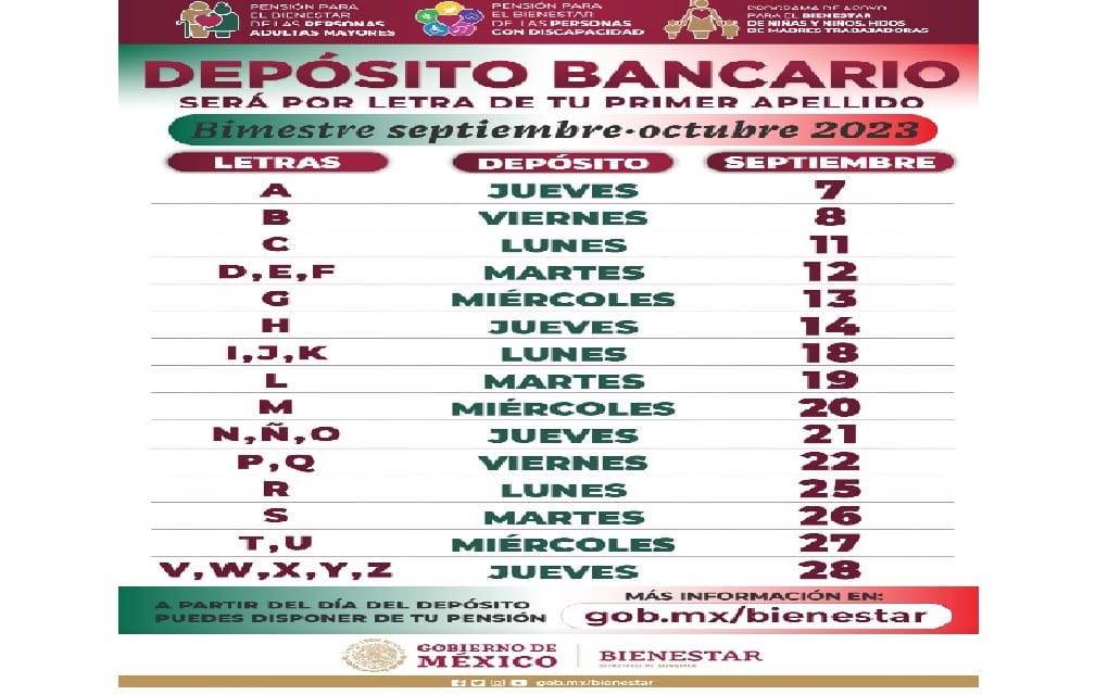 Ciudad Victoria.- Anuncia la Secretaría de Bienestar Federal (Sebien) pago de pensiones y programas del bimestre septiembre-octubre y para ofrecer mejor atención a derechohabientes, el depósito se realizará de acuerdo con la letra del primer apellido del 7 al 28 de septiembre