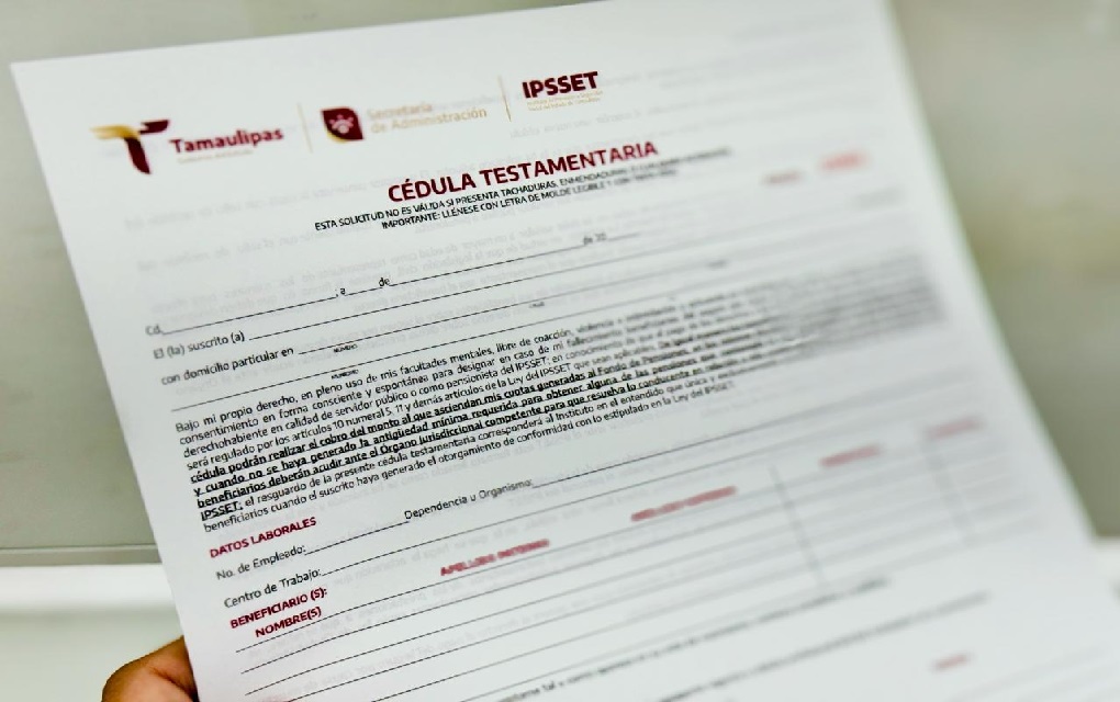 Ciudad Victoria, Tamaulipas.- El Instituto de Previsión y Seguridad Social del Estado de Tamaulipas (IPSSET), invita a los servidores públicos de confianza, extraordinarios, y sindicalizados a tramitar su Cédula Testamentaria, con el objetivo de garantizar una seguridad jurídica a sus familiares en caso de fallecimiento.