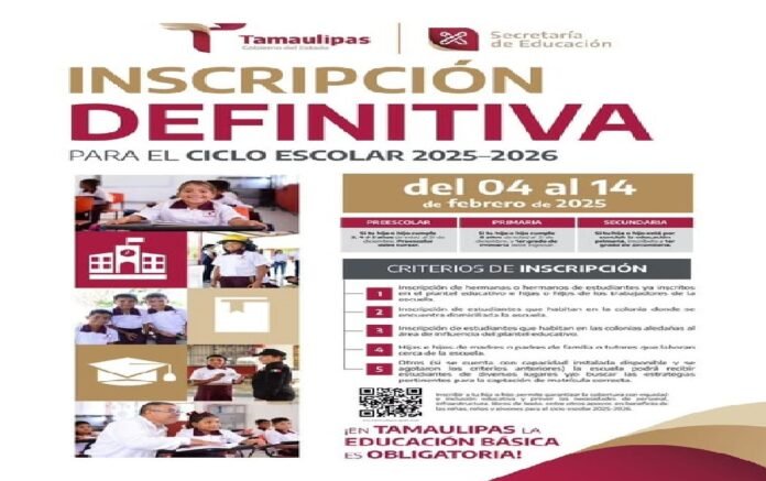 Ciudad Victoria, Tamaulipas.– Marcela Ramírez Jordán, subsecretaria de Educación Básica, dependiente de la Secretaría de Educación de Tamaulipas (SET), que dirige Lucía Aimé Castillo Pastor, informó sobre el inicio del periodo de inscripciones definitivas para el ciclo escolar 2025-2026 en educación básica, invitando a madres, padres y tutores a estar listos para inscribir a sus hijas e hijos a partir del 4 de febrero del presente año.