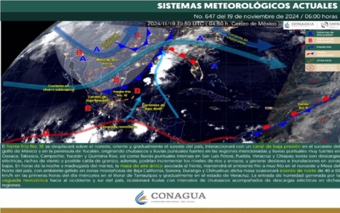 El desplazamiento del frente frío número 10 sobre el noreste, oriente y sureste de México, en interacción con un canal de baja presión, provocará lluvias intensas y condiciones climáticas severas en varias regiones del país. Según el Servicio Meteorológico Nacional (SMN), se esperan precipitaciones puntuales intensas de entre 75 y 150 milímetros en Chiapas, Puebla, San Luis Potosí y Veracruz, y lluvias muy fuertes en entidades como Hidalgo, Oaxaca, Quintana Roo y Yucatán.