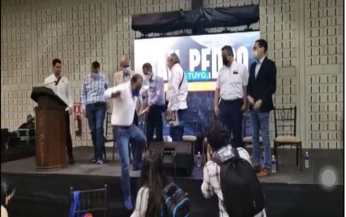 Tras su resbalón, el dirigente fue auxiliado por el diputado local Luis Susarrey, así como el dirigente municipal de San Pedro Garza García, Mauricio Farrah.