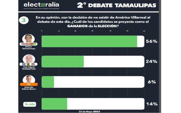 De acuerdo a la encuesta realizada por ‘Electoralia’, el 56 por ciento de los encuestados consideró que a pesar de su decisión de no estar presente en el debate, Villarreal Anaya, candidato común de Morena, PVEM y PT, será el ganador de la elección con el 56 por ciento de las preferencias, muy lejos de César Verástegui, candidato del PAN, PRI y PRD, que registró el 24 por ciento de las preferencias de los encuestados, mientras que Arturo Diez Gutiérrez de Movimiento Ciudadano suma apenas un 6 por ciento.