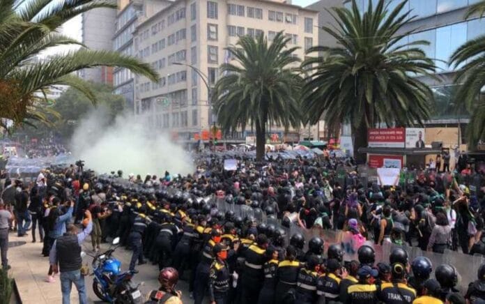 Decenas de mujeres vestidas de negro y con pañuelos verdes, que iniciaron una marcha del Monumento a la Revolución al Zócalo, se enfrentaron con policías capitalinas a la altura de Avenida Juárez y Balderas.