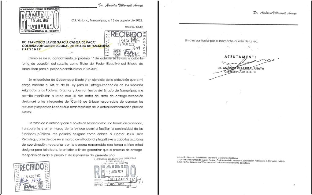 “En mi carácter de Gobernador Electo y en ejercicio de la atribución que a mi cargo confiere el artículo 9 de la Ley para la entrega-recepción de los recursos asignados a los Poderes, Órganos y Ayuntamientos del Estado de Tamaulipas, me permito manifestar a Usted que 30 días antes del acto designaré a los integrantes del Comité de Enlace responsable de conocer los recursos y responsabilidades que serán recibidos de la actual administración pública estatal”, indica el oficio que fue recibido esta tarde en la Oficina del Gobernador Francisco García Cabeza de Vaca.