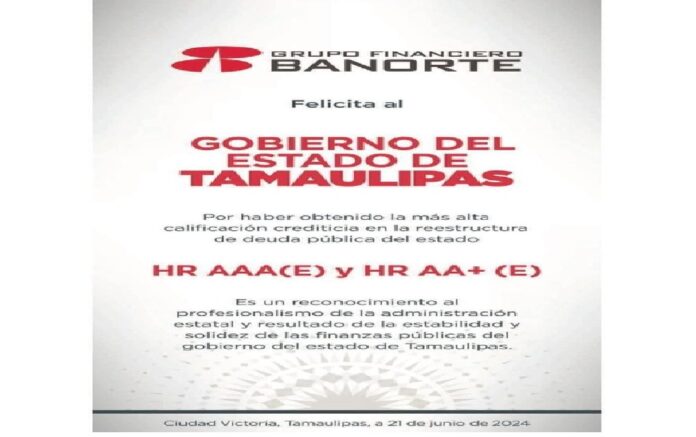 «Es un reconocimiento al profesionalismo de la administración estatal y resultado de la estabilidad y solidez de las finanzas públicas del Gobierno del Estado de Tamaulipas», expresó Banorte.