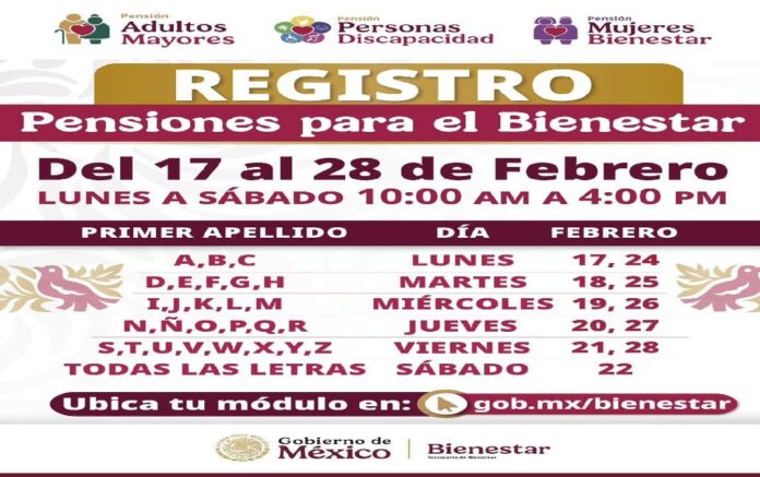 Reyes Rodríguez destacó que del 17 al 28 de febrero se realizará el registro para la pensión de las Personas Adultas Mayores de 65 años y la Pensión de Mujeres Bienestar, según la letra inicial del primer apellido de la Persona Adulta Mayor o Mujer Bienestar, bajo el siguiente calendario: A, B, C: lunes 17 y 24; D, E, F, G, H: martes 18 y 25; I, J, K, L, M: miércoles 19 y 26; N, Ñ, O, P, Q, R: jueves 20 y 27; S, T, U, V, W, X, Y, Z: viernes 21 y 28; y todas las letras: sábado 22.
