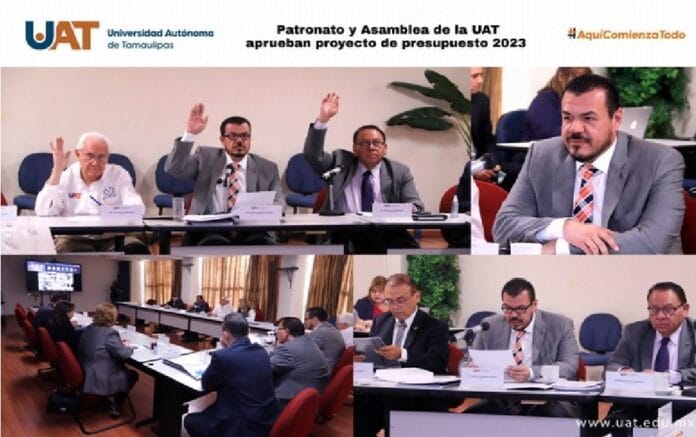 La Asamblea Universitaria aprobó el proyecto de presupuesto anual de ingresos y egresos 2023 de la Universidad Autónoma de Tamaulipas (UAT), que presentó el rector Guillermo Mendoza Cavazos ante el pleno del máximo órgano de gobierno de esta casa de estudios.