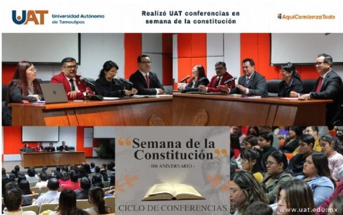 Ciudad Victoria, Tam., 11 de febrero de 2023.- Con el propósito de conmemorar el 106 aniversario de la promulgación de la Constitución Política de los Estados Unidos Mexicanos, la Universidad Autónoma de Tamaulipas (UAT), a través de la Facultad de Derecho y Ciencias Sociales Victoria (FDCSV), llevó a cabo el ciclo de conferencias denominado Semana de la Constitución.