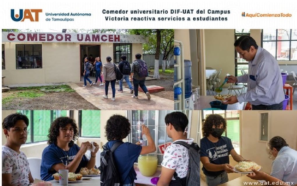 Ciudad Victoria, Tam.; 1 de mayo de 2023.- Con el fin de apoyar en la alimentación de sus estudiantes de escasos recursos, la Universidad Autónoma de Tamaulipas (UAT), en conjunto con el sistema DIF estatal, reactivó el programa de Comedor Universitario de la Unidad Académica Multidisciplinaria Ciencias, Educación y Humanidades (UAMCEH) en el Campus Victoria.