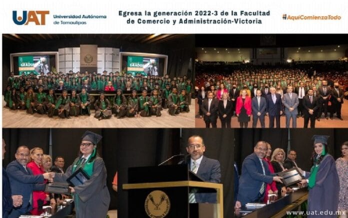 Ciudad Victoria, Tam., 14 de enero de 2023.- La Facultad de Comercio y Administración Victoria (FCAV) de la Universidad Autónoma de Tamaulipas (UAT) llevó a cabo la ceremonia de graduación en la que 179 estudiantes egresaron de las carreras de Contador Público, Licenciatura en Administración, Licenciatura en Economía y Desarrollo Sustentable y Licenciatura en Tecnologías de la Información.