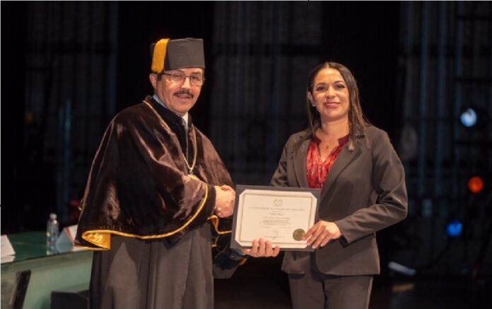 Ciudad Victoria, Tam.; 26 de noviembre de 2024.- El rector de la Universidad Autónoma de Tamaulipas (UAT), Dámaso Anaya Alvarado, reconoció a la Dra. Idolina Bernal González, académica de la Facultad de Comercio y Administración Victoria (FCAV), con el Premio Universitario 2024 “Dr. Norberto Treviño Zapata”, en la categoría de Investigador o Investigadora Joven.