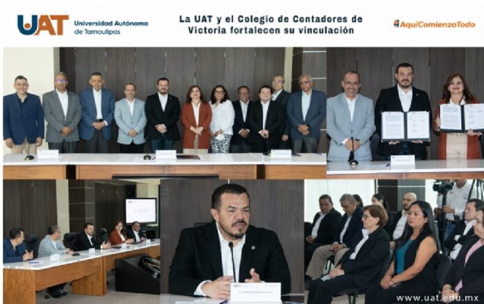 Ciudad Victoria, Tam.; 24 de mayo de 2023.- El C. P. Guillermo Mendoza Cavazos, rector de la Universidad Autónoma de Tamaulipas (UAT), presidió la firma del convenio de colaboración con el Colegio de Contadores Públicos de Ciudad Victoria, mediante el cual se fortalecerán acciones en beneficio del alumnado, docentes e investigadores de la Facultad de Comercio y Administración Victoria (FCAV).