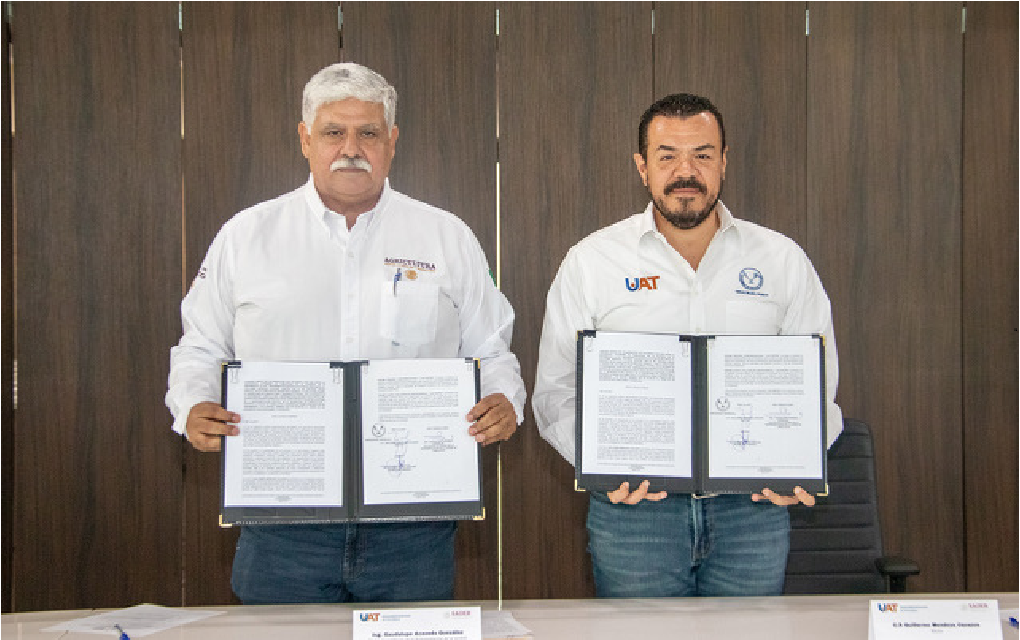 Ciudad Victoria, Tam.; 29 de octubre de 2023.- Mediante la firma de un convenio de colaboración, la Universidad Autónoma de Tamaulipas (UAT) y la Secretaría de Agricultura y Desarrollo Rural (SADER) establecieron el compromiso de trabajar en conjunto para fortalecer la formación de estudiantes e impulsar la investigación en beneficio del campo tamaulipeco.