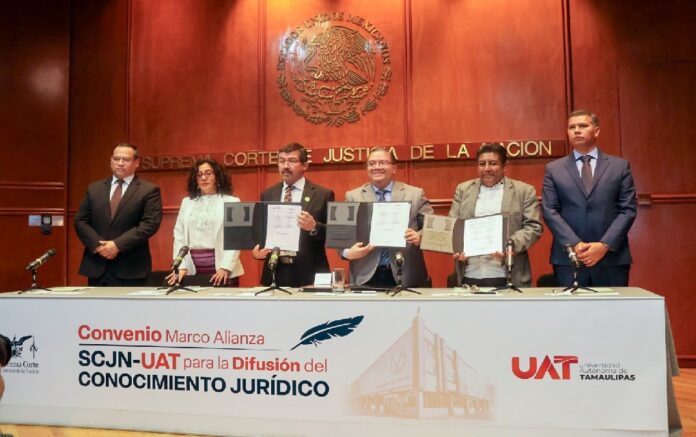 Ciudad de México; 5 de febrero de 2026.- La Universidad Autónoma de Tamaulipas (UAT) y la Suprema Corte de Justicia de la Nación (SCJN) suscribieron el Convenio Marco Alianza SCJN–UAT para la Difusión del Conocimiento Jurídico, así como un convenio específico en materia de servicio social.