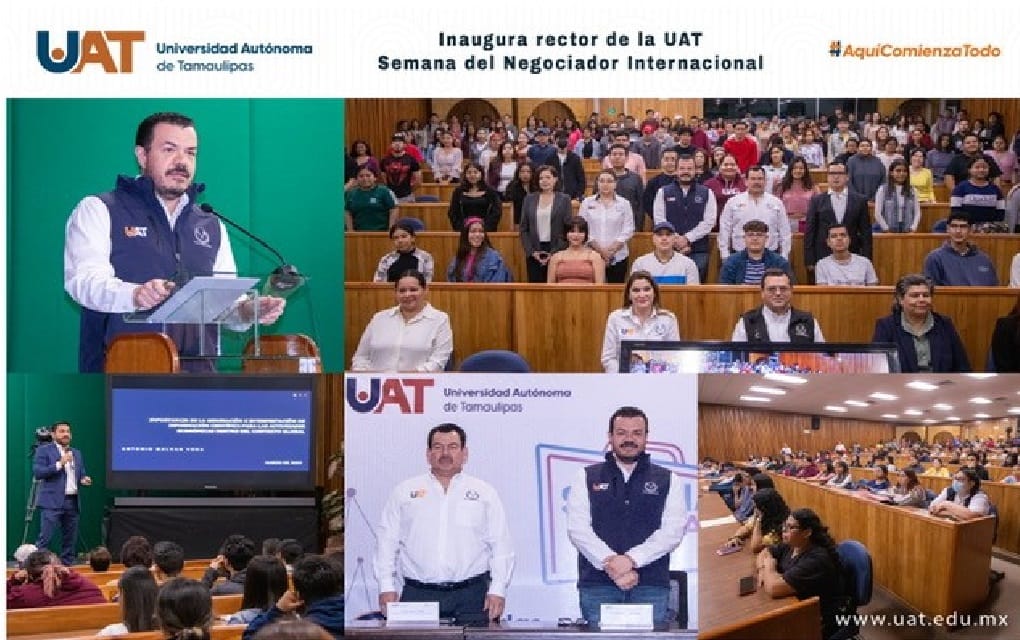 Ciudad Victoria, Tam.; 21 de marzo de 2023.- El C. P. Guillermo Mendoza Cavazos, rector de la Universidad Autónoma de Tamaulipas (UAT), inauguró la Semana del Negociador Internacional, organizada por la Facultad de Derecho y Ciencias Sociales Victoria (FDCSV), evento en el que participan especialistas nacionales y extranjeros.