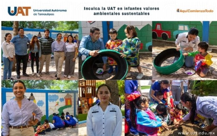 Ciudad Victoria, Tam., 26 de mayo de 2023.- Estudiantes y docentes de la Universidad Autónoma de Tamaulipas (UAT) pusieron en marcha la primera etapa del proyecto “Aprende a cosechar desde preescolar”, el cual propicia el desarrollo de valores ambientales sustentables en infantes mediante su participación en la creación de un huerto escolar elaborado con materiales reciclados.